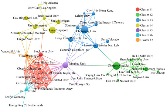 Figure 3 shows the number of articles published by institutions and the partnerships between institutions. Each circular node represents a research institution, and the node size represents the number of articles issued by the institution. The links between nodes represent cooperation. The wider the link width, the closer the cooperation between institutions [63]. Different colors indicate different clusters of institution cooperation. Nodes of the same color belong to the same cluster, which means that the kinship between these nodes is stronger. In Figure 3, there are seven clusters altogether. Although Cluster #5 has only three main items, Tsinghua University has the highest total link strength. Lawrence Berkeley National Laboratory follows Tsinghua University with a total link strength of 21, and it is shown to cooperate relatively frequently with Chongqing University and the Chinese Academy of Sciences.