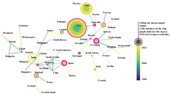 Each individual knowledge network is composed of publications produced over a period of time, which is called a time slice. These independent networks were integrated by CiteSpace to form an overview to express how the field of science has evolved over time [72]. In Figure 4, the corresponding 3-year slice, 1990–2021, shows the networks of the 100 countries with the most publications. CiteSpace describes the changing trends and patterns that are emerging in such networks using various visual attributes [72]. In Figure 4, the node size represents the number of articles produced by a country. The number of articles published in the time slice of each country is described by the citation tree ring: the thicker the citation tree-ring, the greater the number of articles published in that time period. The structural attributes of the nodes are represented by purple rings. The thickness of the purple ring indicates its degree of betweenness centrality (BC). BC is a measure related to the transformational potential of scientific contributions. Nodes with a purple ring often connect different phases of the development of a scientific field.