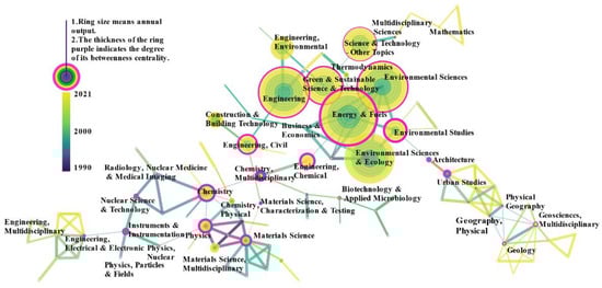 In Figure 5, a purple circle means that the node has a high degree of BC, for example, Chemistry (BC = 0.57), Energy & Fuels (BC = 0.56), Environmental Studies (BC = 0.54), Engineering Chemical (BC = 0.52). This represents the turning points that connect different stages of research and have key impacts on the development of CPCN in buildings. The colors of link and node rings (form cold color to warm color) correspond to the years from 1990 to 2021. Figure 5 illustrates that the number of articles published in most disciplines has increased significantly since start of the 21st century.