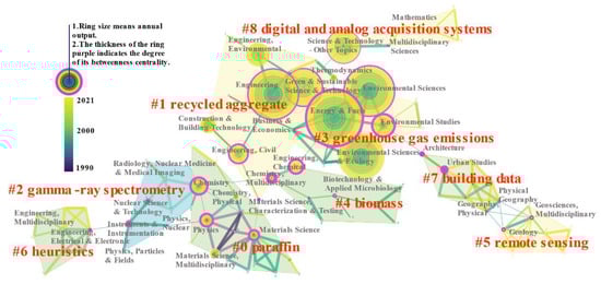 CiteSpace divides the co-occurrence network of subject categories into clusters so that subject categories are closely linked in the same cluster but loosely connected between different clusters. As shown in Figure 6, the most common subject categories are mainly covered by Cluster #1 and Cluster #3, which indicates that using the log-likelihood ratio test method (LLR), the research content from ‘Engineering’, ‘Green & Sustainable Science & Technology’, ‘Engineering Environmental’, and ‘Engineering Civil’ can be extracted and summarized as ‘Recycled Aggregate’, and the research content from ‘Environmental Studies’, ‘Environmental Sciences’, ‘Energy & Fuels’, and ‘Environmental Sciences & Ecology’ can be extracted and summarized as ‘Greenhouse Gas Emissions’.