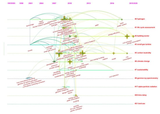 Topics related to CPCN in the building sector can be described using keywords assigned to each article in the data set. The WOS database contains two types of keywords: the ‘author keywords’ provided by the author and the ‘keywords plus’ provided by the journals [5]. We used two sets of keywords from 364 records to make a timeline view using CiteSpace software. Figure 7 shows the research progress for each cluster, and this can be used to understand the changes in research topics. Each cluster is composed of several keywords, among which the clustering keywords are ranked on the right side of the Figure 7, and the time when the keywords first appear is presented at the top. The curved line in Figure 7 indicates the co-occurrence of different keywords. The thickness of the line shows the frequency of co-occurrence: the larger the cross node, the higher the intensity of the keyword bursts. It can be seen from Figure 7 that node ‘System’ (Cluster #0), node ‘Life Cycle Assessment’ (Cluster #1), node ‘Energy consumption’ (Cluster #2), node ‘CO2 emission’ (Cluster #2), node ‘Energy consumption’ (Cluster #2), node ‘Energy’ (Cluster #4), node ‘Performance’ (Cluster #4), and node ‘Impact’ (Cluster #6) have strong bursts. This shows that these topics have been widely studied by scholars, and this can be more accurately understood from Table 6. It is worth noting that a large number of keywords appeared in 2010 and continue to be studied so far. This shows that although the United Nations Climate Change Conference held in Copenhagen in December 2009 failed to produce the new international legal framework for man-made climate change [73], the Copenhagen Accord that resulted from the conference successfully promoted scientific research, and research in the field of buildings has been a positive response to the Copenhagen Accord.