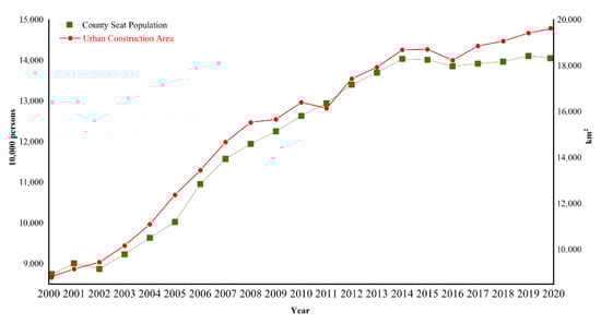 At the provincial and municipal building sector level, potential paths for urban CPCN have also been extensively explored [102,103,104,105], and further detailed research on CPCN has been carried out for commercial and residential buildings [52,106,107,108]. For example, Wu et al. conducted a modeling analysis on Qingdao’s future CO2 emissions (including the number of emission peaks and the time of occurrence) using the STIRPAT model [109]. Huang et al. calculated the carbon footprint of Xiamen city and conducted a low-carbon scenario analysis [110]. Li et al. took Jiangsu Province as an example to analyze how to achieve the carbon emission peak for the provincial building sector [111]. Goomi et al. [112], Farzaneh et al. [113], and Jing et al. [114] developed low-carbon development models for different cities to evaluate low-carbon development scenarios in the city system. With the growth of economy and population, the construction area of the county seat has grown steadily [115]. Based on the data from the China Statistical Yearbook, we illustrated the changes of construction area and population size in county seat in China (see Figure 8) [116]. It shows the growth of population and construction area have the same trend, which means the decrease of ECCE in the county seat faces the huge challenge. Most of the existing studies on CPCN in the building sector focused on the city level, and study with case area focused on the county level has been barely discussed [117]. The potential of energy saving and emission abatement in county seat is worth researching.