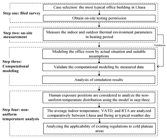 In this study, the indoor and outdoor environmental parameters of an office building were collected through on-site measurement, and the CFD simulation results were verified by the measured parameters. Both experimental data and simulation results were used for indoor temperature distribution analysis. In addition, to further study the uniqueness of the indoor thermal environment in the Tibet Plateau in the typical weather day of winter, the same computational model was used and the simulation results of Lhasa and Beijing were analyzed comparatively. At the same time, taking into account human exposure positions when the vertical air temperature difference (VATD) and RTA were evaluated. Figure 1 shows the framework of this study.