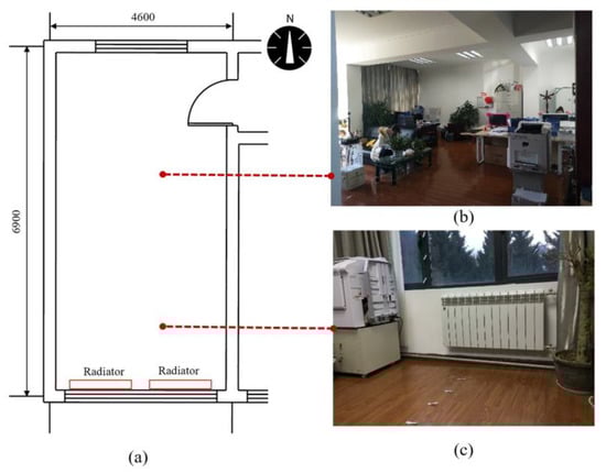 The office room of the building selected: (a) the general layout of the office room; (b) the state of the office room; (c) the south windows and radiator.