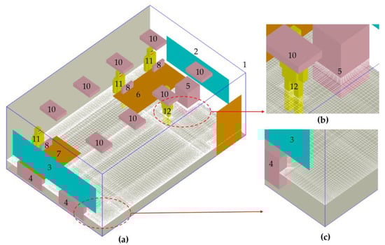 The 3D model and detailed mesh: (a) computational model; (b,c) drawing of partial enlargement.