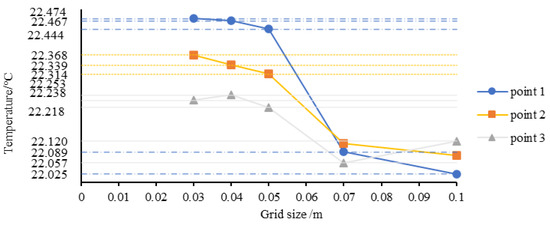 In order to determine the suitable meshing scheme, the gird independence tests were carried out by different numbers of elements. Five grid sizes were considered: 0.1 m, 0.07 m, 0.05 m, 0.04 m, and 0.03 m. Furthermore, the temperatures of points (1.95, 1.1, 3), (1.95, 1.1, 3.45) and (1.95, 1.1, 3.9) are connected in Figure 6. The temperature of the three points changes little when the grid decreases from 0.05 m to 0.03 m. This shows that the impact of grid size on the simulation results can be ignored when the grid size is equal to or smaller than 0.05 m. The results showed that the computational domain was divided into 279,146 small hexahedron cells with finite volumes under optimal grid size. An acceptable grid quality was obtained in which the elements less than 0.15 were severely distorted (Figure 6). The convergence criteria were the solutions of nonlinear equations and relative errors with tolerances from 1 × 10−7 to 1 × 10−3. The residuals of momentum were below 1× 10−3. The simulation converged in 1123 iterations.