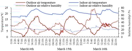 According to the measured data of the office room, the outdoor air temperature in Lhasa ranged between 0.05 °C and 17.96 °C, and the indoor air temperature between 17.01 °C and 24.05 °C. It is indicated in Figure 7 that, similar to the outdoor air temperature, the indoor air temperature rose from morning to afternoon and fell at about 5 p.m., but the daily range of the outdoor air temperature was much greater than that of the indoor temperature. This is mainly due to the thermal inertia of the building, the use of radiators, and the fact that the windows and door were kept almost closed. Moreover, the average indoor air relative humidity stayed stable, around 21%, while the outdoor air relative humidity fluctuated between 6.11% to 77.21%.