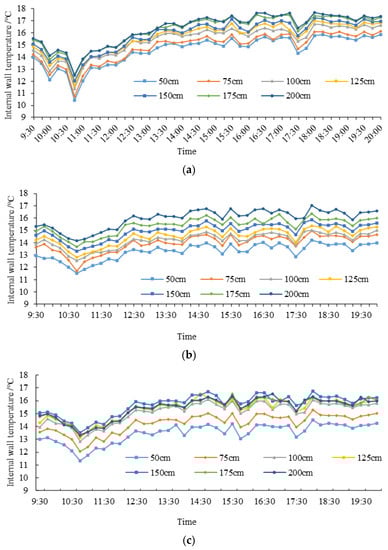 Variations in wall temperature at different locations with time: (a) east wall; (b) west wall; (c) north wall.