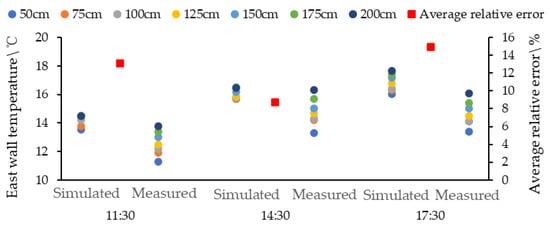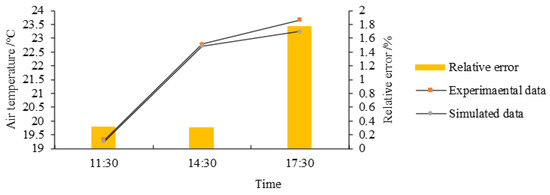 To examine the accuracy of the computational model, the results from 14 March were compared. The input ambient environment parameters are the measured data. The solar load model parameters include local time and position. The sunshine fraction and ground reflectance were 1 and 0.2, respectively. Figure 9 presents the relative errors of air temperature on the test point between the simulation and the experiment at different times. The measured air temperatures at 11:30, 14:30, and 17:30 were 19.32 °C, 22.79 °C, and 23.67 °C, respectively. The simulated results agreed well with the measured data. The calculated relative errors were within 2%. The west wall temperatures are shown in Figure 10; the simulated and measured wall temperatures had the same change trend, with the height rising from 50 cm to 200 cm. The simulated wall temperature was higher than that of the measured temperature by 2.62 °C. This was because the thermal inertia of the envelope was not considered in the simulation. The actual ground temperature was lower, and the measured temperature stratification was more obvious. Nevertheless, the relative error of the wall temperature at different times was less than 15%. These results illustrate that the developed CFD model can reflect the indoor temperature with sufficient accuracy.