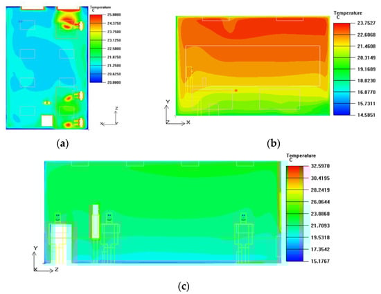 Air temperature distribution at 2:30 pm on 14 March: (a) Y = 0.6 m; (b) Z = 3.45 m; (c) X = 2.3 m.