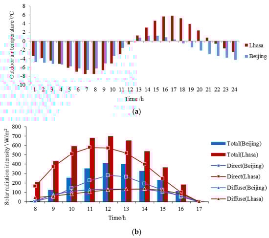 The meteorological parameters of typical weather days in Lhasa and Beijing in January are shown in Figure 12 [36]. As can be seen from Figure 12a, the outdoor air temperature is below 0 °C in the forenoon in the two cities. Furthermore, the temperature in Lhasa ranges from −7.6 °C to 5.8 °C, with a diurnal range of 13.4 °C, but the temperature in Beijing varies from −6.6 °C to 1.2 °C with a diurnal range of 7.6 °C. The time zone in Lhasa is two hours later than that in Beijing. Thus, the solar radiation intensity in Lhasa is two hours behind the actual values in Figure 12b. This is almost identical to Beijing, but Lhasa’s direct solar radiation intensity is significantly higher than that of Beijing. As a result, the global solar radiation intensity in Lhasa is higher. At midday, the global solar radiation intensity in Lhasa is 696 W/m2, but in Beijing it is 411 W/m2. Consequently, the outdoor temperature in Lhasa exceeds that of Beijing in the afternoon, resulting in a higher daily average temperature in Lhasa. Due to the time difference, the highest measured temperatures in Lhasa and Beijing occurred at 17:00 and 15:00, respectively.