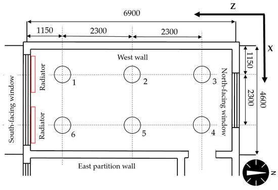 The RTA value depends on the view factor between the human body and the surrounding surface. Different parts of the human body, the surfaces of the building envelope, and the heat source will produce different net radiative heat transfers, resulting in inconsistent radiant temperatures of various parts of the human body surface. The difference between the radiation temperature of the plane of the two opposite sides for the human body is RTA. Hence, six indoor points were selected as the human body position to study the non-uniform thermal distribution under the influence of a unique climate, as shown in Figure 13. In this model, the seated persons are facing east (X-axis reverse). The numerical model settings of the building envelope, radiator, and lamps are consistent with Section 2.2.