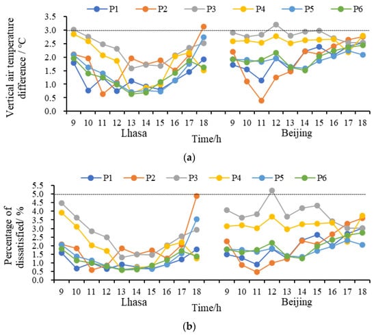 Even in the morning during March and wearing leather boots, the feet still feel uncomfortably cold. However, the body does not feel cold. In addition, as shown in Figure 11, the phenomenon of the thermal stratification of indoor air is obvious. Therefore, the VATD is a problem worth analyzing. According to the model configuration provided by the “Evaluation Standard for the Indoor Thermal Environment in Civil Buildings” (GB/T 50785-2012) [38] and ISO 7730-2005 [23], when the human body is in a sitting position, the air temperature around the head and ankles are set to 1.1 m and 0.1 m, respectively. In addition, the percentage of dissatisfaction caused by the VATD is calculated according to [23,38]: