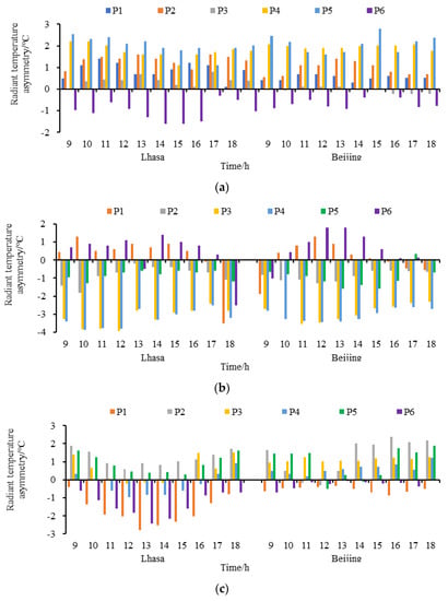 The RTA in the Y direction refers to the average radiant temperature difference between the head and ankle, as shown in Figure 16c. The ankle receives more heat than the head when the human body is seated in P1 and P6. Therefore, the radiation temperature of the ankle is higher than that of the head, resulting in a negative RTA in the Y direction. Lhasa has the largest RTA at P1 in the Y direction, which can reach −2.79 °C, with of 0.35%. The RTA of Beijing at P1 is relatively small, with a maximum of −1.86 °C. When individuals are in P2 and P5, they are far away from the outer window and receive less cold radiation. Therefore, the average radiant temperature of the head is relatively high, and the RTA in Lhasa is positive in the Y direction. In addition, the average radiant temperature of the head in P4 in Lhasa is lower than that of the ankle when the solar radiation is strong. This can be explained by the fact that the radiation temperature on the side of the head near the radiators and the south outer window is higher, and the radiation temperature on the other sides is lower, especially the left side near the north outer window. Nevertheless, the ankle is far from the outer window, and its average radiation temperature is relatively high. Due to the relatively weak solar radiation in Beijing, the influence of solar energy on indoor radiant temperature is small. Coupled with the influence of outdoor temperature, the average radiant temperature of P4 in Beijing is lower than that in Lhasa. At noon, the average radiant temperature of the head and ankle of P4 in Lhasa are 12.6 °C and 13.56 °C, while the average radiant temperatures of Beijing at that this position are 12.2 °C and 11.96 °C, respectively. The cold radiation caused by the north outer window on the head has a weaker effect on the average radiation temperature than the indoor thermal stratification. Therefore, the RTA of Beijing P4 in the Y direction is positive.