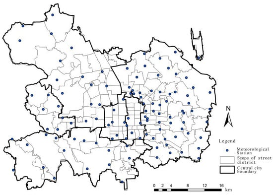 Distribution of street districts and weather stations in the central urban area of Beijing.