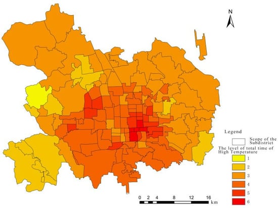 Firstly, the hourly maximum temperature from 463 meteorological stations in the central urban area of Beijing were collected and processed. A high-temperature day in China refers to a day on which the maximum temperature is ≥35 °C. The most comfortable temperature range for humans is 19–24 °C. Elderly individuals need to avoid the risks of high temperatures when temperatures exceed 34 °C according to the scientific popularization content about humans’ comfortable temperature of the China Meteorological Data Network [24]. Therefore, 34 °C was adopted as the critical high temperature value and the total duration when the temperature was greater than or equal to 34 °C in July 2019 was calculated (as shown in Figure 2).