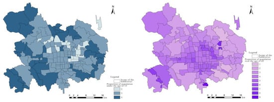 Population distribution in street districts in the central urban area of Beijing (left: population proportion under the age of 15 years; right: population proportion over the age of 65 years).