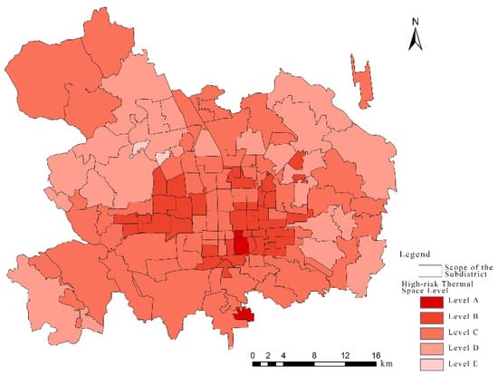 From the humanistic perspective, the impact of high-temperature weather on vulnerable groups was discussed to determine high-risk heat exposure spaces in the central urban area of Beijing. High-risk heat exposure spaces where people under the age of 15 years and over the age of 65 years lived were integrated with each other to obtain the distribution level of high-risk heat exposure at the street district scale. By integrating the above results, the street districts with high-risk heat were “marked red” and divided into five levels: A-level high-risk heat space, B-level high-risk heat space, C-level high-risk heat space, D-level high-risk heat space, and E-level high-risk heat space (the risk gradually reduces from A-level to E-level) (as shown in Table 3).