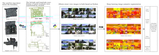 The environments of Qianmen street district, Tiantan street district, and Donggaodi street district were analyzed from the humanistic perspective. The main influencing factors were recognized to be the vegetation coverage, proportion of cold space area, green looking ratio, cooling materials, infrastructures, and artificial heat source, of which cold spaces consisted of rivers, lakes, and green space. Relevant studies have shown that green spaces, rivers, and lakes can act as “cold islands” in cities and cause a decrease in the temperature [27]. The green looking ratio, cooling materials, infrastructure, and artificial heat source were considered as street space elements that people can see and feel in the space based on the human perspective, which were the most visualized parts that had an impact on human feeling. Street space elements were obtained by translating and computing the street view pictures, and the vegetation coverage and proportion of cold space areas were obtained by implementing integration, correction, and computing in ENVI and ArcGIS (as shown in Figure 6).
