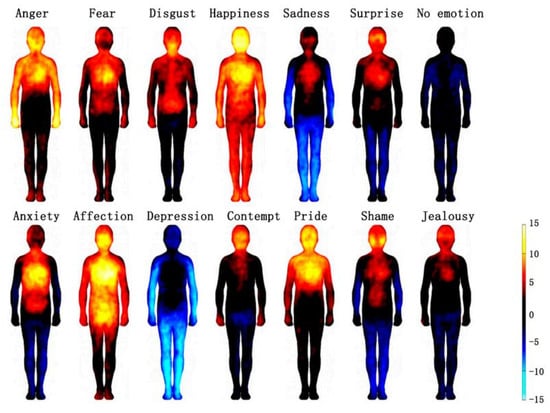 Emotion and energy activation of the human body (The colorbar indicates the t-statistic range where pixel intensities reflect statistically significant experienced bodily changes associated with each emotional state). Reprinted from Ref. [30].