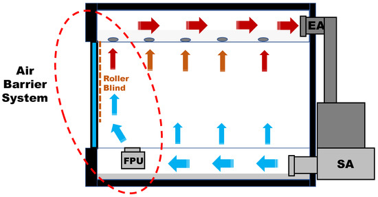 For the office building, a variable air volume (VAV) underfloor air distribution system was used to provide appropriate airflow to control thermal behaviors in the perimeter zones, as shown in Figure 1. To reduce the loads through the windows at the west façade due to solar radiation, the air barrier system was employed. The air barrier system used supply air provided by the underfloor air distribution system. The airflow headed to the interior of the west façade through the roller blind. The setpoint temperatures for the summer and winter were 26 °C and 22 °C, respectively. The relative humidity for the summer and winter was set as 50%. The components of the air barrier system installed in the selected building are presented in Figure 8.