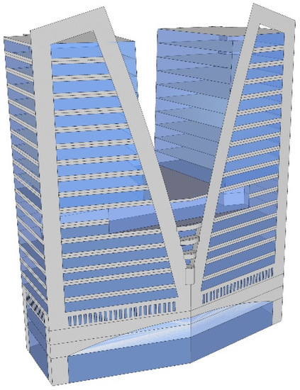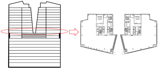As mentioned earlier, the present study investigated the thermal performance in the perimeter zones due to solar radiation. For the methodology, the office building was chosen, which is located in Seoul, South Korea. The office building was built in 2007, and the gross floor area is 72,718 m2. The design characteristics of the building are as follows: it has 21 floors above ground and 7 floors below, and the main façade faces the west and is covered by glass. Figure 2 presents the main façade of the office building, and the specific information is available in Table 1. In addition, Figure 3 shows the cross-section and a plan of the 10th floor of the building.