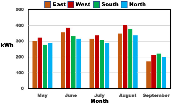 After the validation of the energy simulation by using IES VE software, the energy consumption of the reference office building by orientations was calculated. Figure 6 and Table 5 show the cooling loads by different building orientations from May to September. As can be shown, the biggest cooling load was observed when the building faced west, while the minimum cooling load was calculated when the main façade faced south. Since South Korea is in the northern hemisphere, the admitted solar radiation is minimized. Oppositely, the admitted solar radiation is maximized with the west building orientation, caused by a low angle of the sun. In addition, when the building faces west, the cooling load is worsened in the summer more than in the winter due to longer days in the summer. Moreover, all the cooling loads on the graph decreased rapidly in September. It can be seen that solar radiation is reduced by seasonal change.