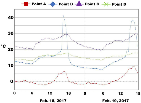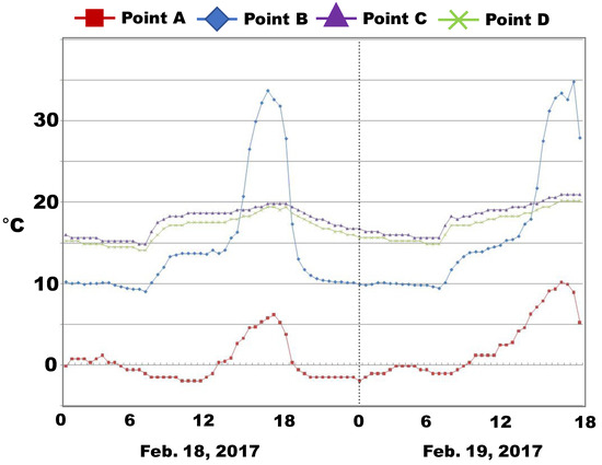 The measurement results are shown in Figure 10 and Figure 11. In Figure 10, the biggest temperature (about 35 °C) on the 5th floor was observed at the interior surface of the glass during 3 PM–6 PM due to the maximum exposure of the sun to the west façade. In addition, a similar trend was observed in the temperatures of Point C and Point D. The temperature difference between these two points was about 1 °C–2 °C, and the temperature at Point C was higher than that at Point D. It can be seen that heat from solar radiation increased indoor temperatures. In the case of the temperature distributions on the 10th floor (Figure 11), similar temperature trends to the temperature distributions on the 5th floor were shown. However, the temperature at the interior surface was higher than that of the 5th floor, at about 40 °C. This was caused by direct sunlight, because there were no neighboring buildings higher than the 10th floor. This also affected the temperature increase in the perimeter zones on the 10th floor, which was about 5 °C higher than that of the 5th floor.
