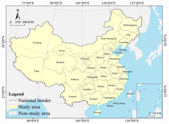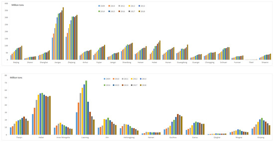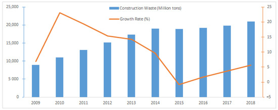 The study area of this paper is mainland China, covering 31 provinces, autonomous regions, and municipalities directly under the central government, but excluding Taiwan, Hong Kong, and Macao (Figure 1) with consideration of data accessibility, completeness, and comparability, as well as the difficulty of data acquisition due to the fact that the statistical calibers are different between Hong Kong, Macau, Taiwan, and mainland China. According to the trend of the construction waste change 2009–2018 in China, it is divided into two periods of rapid growth and steady development, with the former having an average annual growth up to 18%, while that of the latter decreasing to about 2.54% (Figure 2).