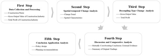 This study is performed in five steps (Figure 3). The first step is raw data collection and processing. It involves the compilation of data for the study area 2009–2018, including construction waste, gross output value of construction industry, and total profit of construction industry. The second step is the analysis of spatial and temporal changes. Firstly, the current characteristics and changing trends of construction waste emissions in 31 provinces are presented from the time dimension. Secondly, the spatial pattern and evolution characteristics of inter-provincial construction waste emissions are studied based on the cluster analysis method of GIS. The third step is decoupling analysis, to analyze the connection between construction waste change and construction economic growth based on the perspectives of gross output value and total profit. The fourth step is discussion and reflection. A comparative analysis of the main findings reached in the analysis of the results is conducted to reflect on and summarize the innovation and shortcomings in this paper. The fifth step is the application of conclusions. Based on the trends and problems of construction waste emissions in provinces of China, further differentiated response strategies are proposed to provide a reference for the government to carry out construction waste management and industry governance policy design for decision making.