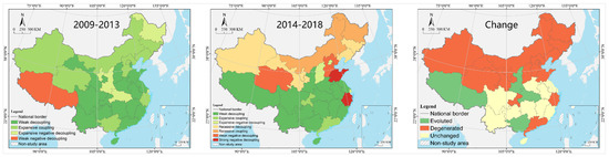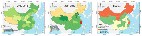 From the changes of decoupling types in 2009–2013 and 2014–2018, only Guangxi, Hubei, Shaanxi, and Qinghai evoluted, and they were geographically dispersed. More than half of the regions degenerated, including Xinjiang, Inner Mongolia, Gansu, Jilin, Heilongjiang, Tianjin, Zhejiang, and Guangdong, concentrated in the northern regions of China. About 35.48% of the territory remained unchanged, mainly in the central and southwestern regions, including Jiangsu, Anhui, Henan, Jiangxi, Fujian, Hunan, Guizhou, Sichuan, Yunnan, and Hainan (Figure 8).