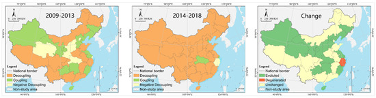 In 2009–2013, about 41.49% of the territory was in the decoupling state, distributed in a band in northeast, southwest, and central China. Xinjiang, Gansu, Ningxia, Liaoning, Hebei, Tianjin, Jiangsu, and Fujian were in the coupling state, and most of them were concentrated in the northwest and Bohai Bay region. Qinghai, Beijing, Shanxi, Shaanxi, Hubei, and Shanghai were in the negative decoupling state, accounting for less than 20% and geographically dispersed. In 2014–2018, the decoupling space expanded significantly, accounting for up to 87.10%. Tianjin, Shanghai, and Hubei were in the coupling state, while Zhejiang was in the negative decoupling state and became a problematic region. From the changes of decoupling types in 2009–2013 and 2014–2018, more than about 55% of the geographic areas evoluted, including Xinjiang, Gansu, Qinghai, Ningxia, Shaanxi, Shanxi, Hebei, Beijing, Jilin, Liaoning, Hubei, Hunan, Guizhou, Jiangsu, Shanghai, Fujian, and Hainan, concentrated and contiguous in zonal distribution. Only Zhejiang degenerated, and 41.94% of the territory remained unchanged (Figure 7).