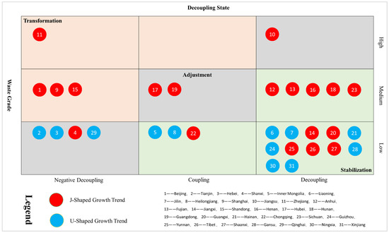 (4) Based on construction waste emission levels, change trends, and decoupling types combined, the 31 provinces are divided into three types of policy zones of transformation, adjustment, and stabilization, and differentiated and targeted recommendations are made to provide a basis for the government to develop construction waste management policy design. As the northeast and northwest regions degenerate into the recessive decoupling state, and some developed coastal regions such as Zhejiang, Shandong, and Tianjin change from decoupling to recoupling or connecting again, they become problematic regions that restrict the overall performance improvement of construction waste management and sustainable development of the construction economy in China.