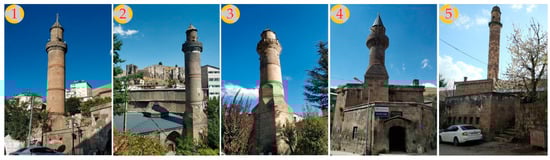 Visuals of Five Minarets: (1) Ulu Mosque Minaret, (2) Şerefiye Mosque Minaret, (3) Meydan Mosque Minaret, (4) Kalealtı Mosque Minaret, and (5) Gökmeydan Mosque Minaret.
