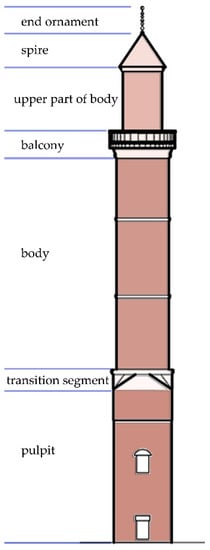 In general, minarets consist of the pulpit, the transition segment, the body, the balcony, the upper part of the body, the spire, and the end ornament from bottom to top. As an example, parts of the Ulu Mosque minaret are shown in Figure 3. The parts of the other four minarets are similar to the Ulu Mosque minaret. There is no difference in the parts of Five Minarets.