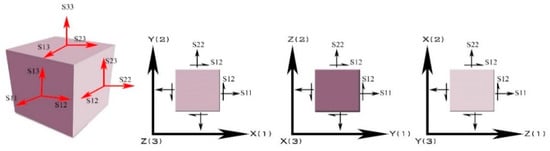 The macro modeling technique is one of the masonry structural modeling techniques and is widely used. While performing this type of modeling, analyses are carried out without making any distinction between the binding material (mortar, etc.) used in the building and the structural elements. In this modelling, the masonry unit and the properties of the mortar are homogenized and considered as a masonry composite material. The mechanical properties of this model are the values obtained as a result of the homogenization process. Macro modelling is more convenient in practice because it requires less memory and time. However, with macro modelling, stress distributions in masonry units and mortar can be obtained accurately [55,56,57,58] In this respect, structural masonry elements are considered composites, and an equivalent material model is used for all minarets models. Structural analyses were carried out for the Five Minarets in Bitlis using this macro-modeling technique. The mortar and Bitlis stone used in the minarets were considered as a single material. The sign criterion for the stress components of the elements used in the finite element model of the structure is shown in Figure 6, in accordance with the assumptions stipulated by the software [59] in which numerical modeling is made.