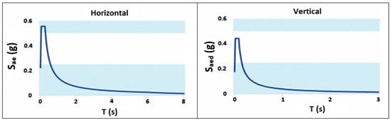 As stated in Figure 6, S11 is vertical stress in (x) direction, S22 is vertical stress in (y) direction, S33 is vertical stress in (z) direction, and S12 = S21 constitute shear stresses in the x-y plane. With TBEC-2018, which was updated in 2018 and entered into force on 1 January 2019, the biggest change was the use of site-specific design spectra. Turkey Earthquake Maps Interactive Web Application has been developed to calculate design spectra and site-specific earthquake parameters. With the help of this application, horizontal and vertical design spectra can be obtained as well as earthquake parameters belonging to any desired geographical location. By using the coordinate values obtained for each minaret, design spectra and earthquake parameters were obtained with the help of this application. While obtaining these values, the design ground motion level DD-2 was chosen as the earthquake ground motion level. From the ground survey reports received from the relevant institutions, the ZB soil class was taken into account for all five minarets as the local soil class. As it can be seen from Table 3, the design spectra were obtained close to each other since the seismic parameters for the minarets are close to each other. The horizontal and vertical spectra obtained for the Ulu Mosque Minaret are shown in Figure 7 as an example. In these curves, the horizontal axis represents period values, while the vertical axes represent the horizontal and vertical elastic design spectral accelerations, respectively.