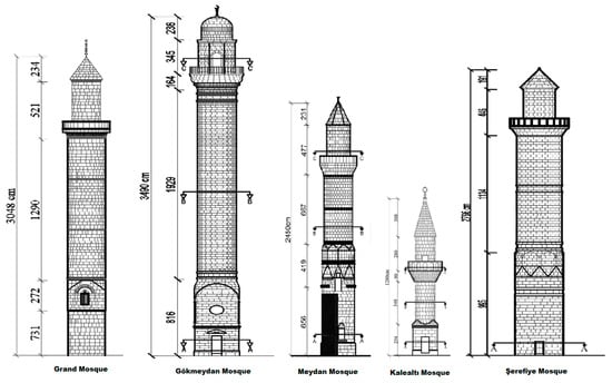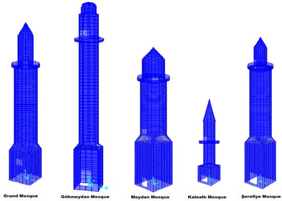 - Uğurlu, M.A.; Günaslan, S.E.; Karaşin, A. Modelling and structural analysis of the Four-legged minaret. DU J. Eng. 2017, 8, 413–422. [Google Scholar]