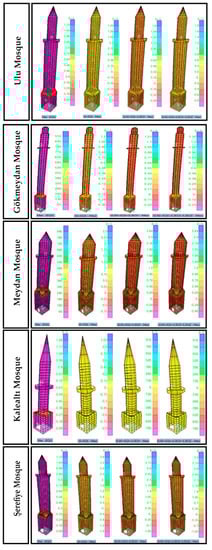 Modal analysis is a dynamic analysis method that enables the determination of free vibration periods, frequency values, mass participation rates, and mode shapes of the structure. In order to determine the dynamic properties of the minarets, primarily modal analyzes were carried out. In TBEC-2018, it was requested to be determined according to the rule that the mass participation rates in the X and Y directions should not be less than 95%. In this case, modal analyses were carried out by considering the first 34 modes for the Ulu Mosque minaret; the first 24 modes for Gökmeydan mosque minaret; the first 44 modes for the Meydan Mosque minaret; the first 31 modes for the Kalealtı mosque minaret; and the first 43 modes for the Şerefiye Mosque minaret. The values related to the mass participation rates, natural vibration periods, and effective modes obtained by considering the first five modes of Five Minarets as a result of the modal analysis are shown in Table 5. Torsion in all minarets occurred in the fifth mode.