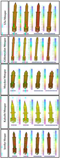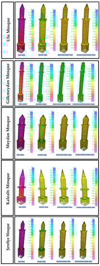 The fact that the structural dimensions such as total height, diameter, wall thickness, and pulpit dimensions of the minaret had different values for Five Minarets caused the analysis results to be different from each other. Therefore, compressive, tensile, shear stresses, period, and displacement values differed.