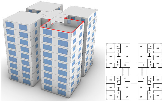 The main settings and building components of the investigated residential building are shown in Table 2 and Table 3, respectively. The building was modeled and simulated according to SI5282-1, Energy rating of buildings: Residential buildings [11], requirements. As a result, the resolution of the process was carried out at the level of apartments, each defined as one thermal zone. To speed up the simulation time, some of the windows were unified in the modeling (Figure 2).