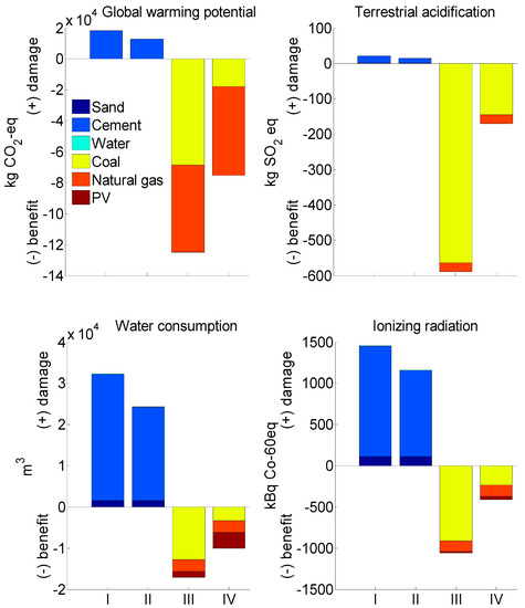 According to the ecoinvent v3.2 database [18], the production of sand includes the whole manufacturing process for digging of gravel and sand, transport, and infrastructure for machinery; the production of cement includes manufacturing, transport, and infrastructure; the use of water includes infrastructure and water treatment; the production of coal and natural gas electricity includes fuel input, infrastructure, and substances needed for operation; and the production of PV-based electricity includes the infrastructure for a 3 kWp PV plant and water for cleaning.