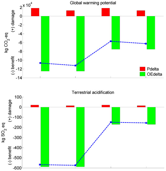 The high OEdelta value is achieved through the use of coal and natural gas (fossil fuel sources of electricity). During the burning process, coal releases large amounts of carbon dioxide (CO2), sulfur dioxide (SO2), nitrogen oxide (NOx), and methane (CH4) into the environment. Natural gas is considered to be a cleaner source of electricity than coal because it produces lower CO2, SO2, and NOx emissions [23]. Emitted CO2, SO2, and NOx increase global warming potential and terrestrial acidification, among other effects [24]. As a result, a large benefit in terms of global warming potential and terrestrial acidification impact was shown for the 2020 and 2025 OEdelta values. The results are more pronounced for the former than the latter due to a decrease in the total amount of coal and gas from 87% in 2020 to 65% in 2025 [16].