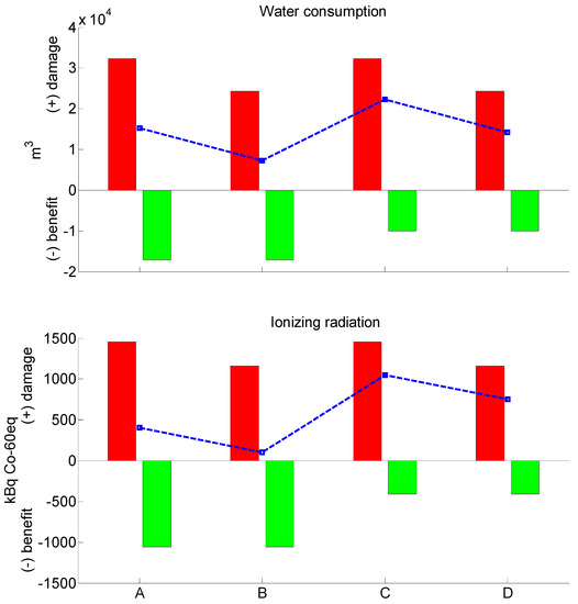 We can conclude, considering the two impacts with benefit (global warming potential and terrestrial acidification) and the two with damage (water consumption and ionizing radiation), that the total midpoint result cannot be unequivocally interpreted to decide on the damage/benefit of F1. In this respect, Huijbregts et al. [22] noted that midpoint results have lower uncertainty but cannot be interpreted easily. The other tiles (F2, F3, F4, and F5) showed similar benefit/damage results concerning the studied impacts, therefore those are not presented here.