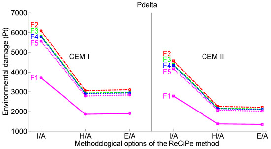 Compared to CEM I Pdelta, the damage of CEM II Pdelta decreased by 25, 26, and 29% in I/A, H/A, and E/A, respectively. This is due to a decrease in the content of clinker, the most environmentally damaging component of cement, from 95 to 65% [26].