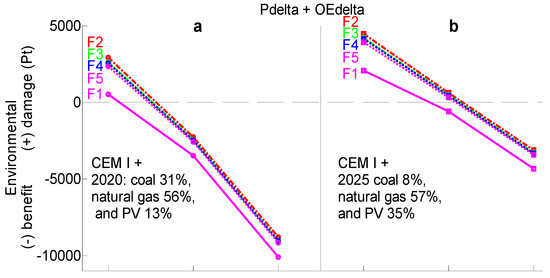 Figure 4 shows the impact of the four combinations of CEM I Pdelta, CEM II Pdelta, 2020 OEdelta, and 2025 OEdelta evaluated for the F1 sculptured tiles. For each combination, the dotted line shows the total Pdelta + OEdelta results. For current and future sources of electricity (based on 2020 and 2025, respectively), the overall results for Pdelta and OEdelta are as follows: global warming potential and terrestrial acidification resulted in environmental benefit, and water consumption and ionizing radiation resulted in environmental damage.