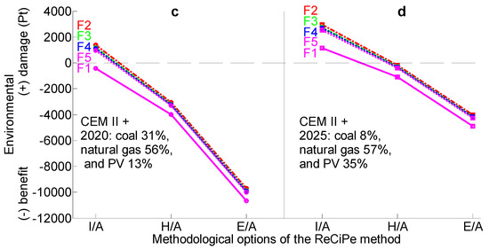 However, for CEM I and CEM II with future OE electricity sources (right panel), the I/A option results in environmental damage and the E/A option results in environmental benefit, whereas the H/A option shows no consequence regarding damage/benefit (F1 leads to benefit, while F2–F5 lead to similar environmental results to the referenced flat tile).