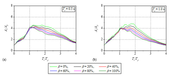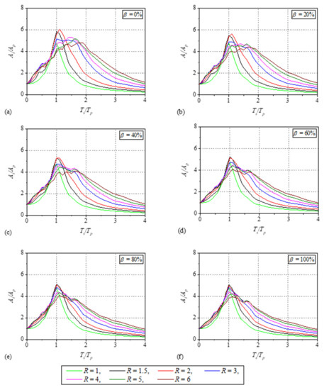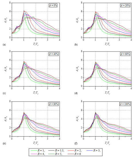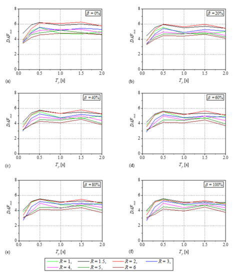 - The effect of the primary structure initial vibration period , response reduction factor , and energy dissipation parameter on the FRS is studied. A single peak was observed on the mean normalized FRS for , but for , the maximum value of the mean normalized FRS is nearly constant over a wide period range and forms a spectral plateau. The width of the spectral plateau increases with increase in and decrease in , which is due to the higher ductility demand on the primary structure. In addition, the peak value of mean normalized FRS increases when changes from 1 to 2 and then decreases for . The reduction in the mean normalized FRS was observed with increase in . With increase in , the maximum dynamic amplification factor , increases for , and remains nearly constant for and .