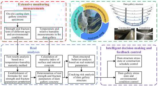 China’s dam construction has entered the era of intelligence, and a complete set of technologies, such as intelligent water-cooling, intelligent grouting, and intelligent spraying, based on extensive monitoring measurements, real analyses, and intelligent decision making, as well as closed-loop feedback control theory, have been gradually formed [3]. As an integral part of this set of technologies, this study proposes a method for determining and applying the real strength and fracture parameters of dam gallery concrete considering the ambient temperature and humidity. The specific process is shown in Figure 1. This method can determine the reliable material parameters of the gallery concrete at any time under real environmental conditions, which can be used for real-time cracking risk analysis of the dam gallery structure, and can then provide a basis for the optimization of the dam structure’s operating status, the formulation of the construction schedule, or the control of gallery’s temperature and humidity, etc.
