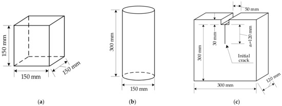 In this study, a total of 300 gallery concrete strength specimens and 75 fracture specimens were cast. There are 60 strength specimens and 15 fracture specimens of 5 different test ages for each temperature and humidity condition. The three different types of specimens cast in the experiment are shown in Figure 2. Among them, the cube specimens with dimensions of 150 mm × 150 mm × 150 mm are used to determine the compressive strength fc and splitting tensile strength ft of concrete. The cylinder specimens with a size of φ150 mm × 300 mm are used to measure the axial compressive strength facs and static compressive elastic modulus Ec of concrete. The wedge-splitting specimen with a size of 330 mm × 300 mm × 120 mm and initial crack length to height ratio of 0.4 is used to determine the equivalent fracture toughness KIC and fracture energy GF of the concrete.